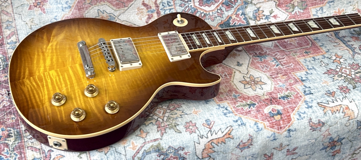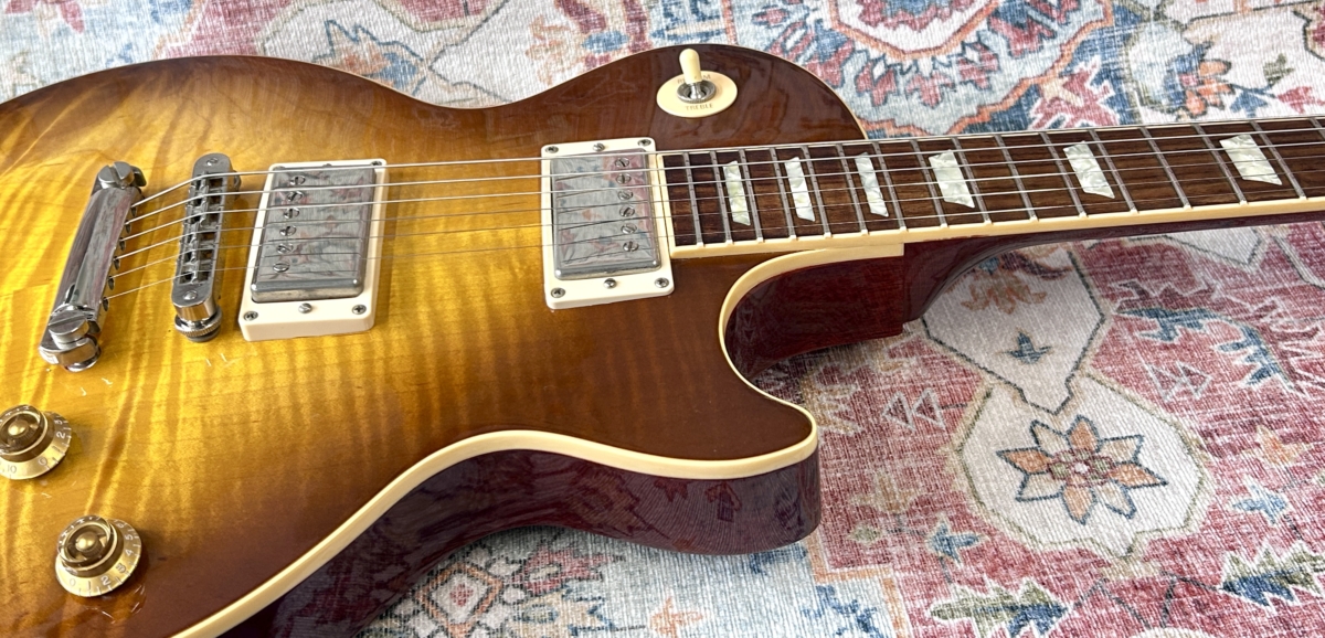 Condition wise :- Clean frets and fingerboard, hence no nail wear – If there is a touch criticism about the frets, then you’d have to be very fussy to have any issue with the merest hint of wear to the first 3/4 frets, mainly the plain strings – It is barely worth a mention and many years of seriously playing lies ahead before any thoughts as to a fret dress is required – Look on the rim of the body and the rear of the neck and all is good and clean – Look on the rear of the body and you’ll discover light compression marks/grazes – More subtle rather than nasty – Ditto when you look at the burst gloss finish on the figured maple top – You’ll find the usual tarnish/oxidization to the nickel hardware – So not a case queen, but equally it doesn’t look like it has spent years on the road touring with a punk band – As such you can play it without having to give it the kids glove treatment – More of a lightly played in VOS character