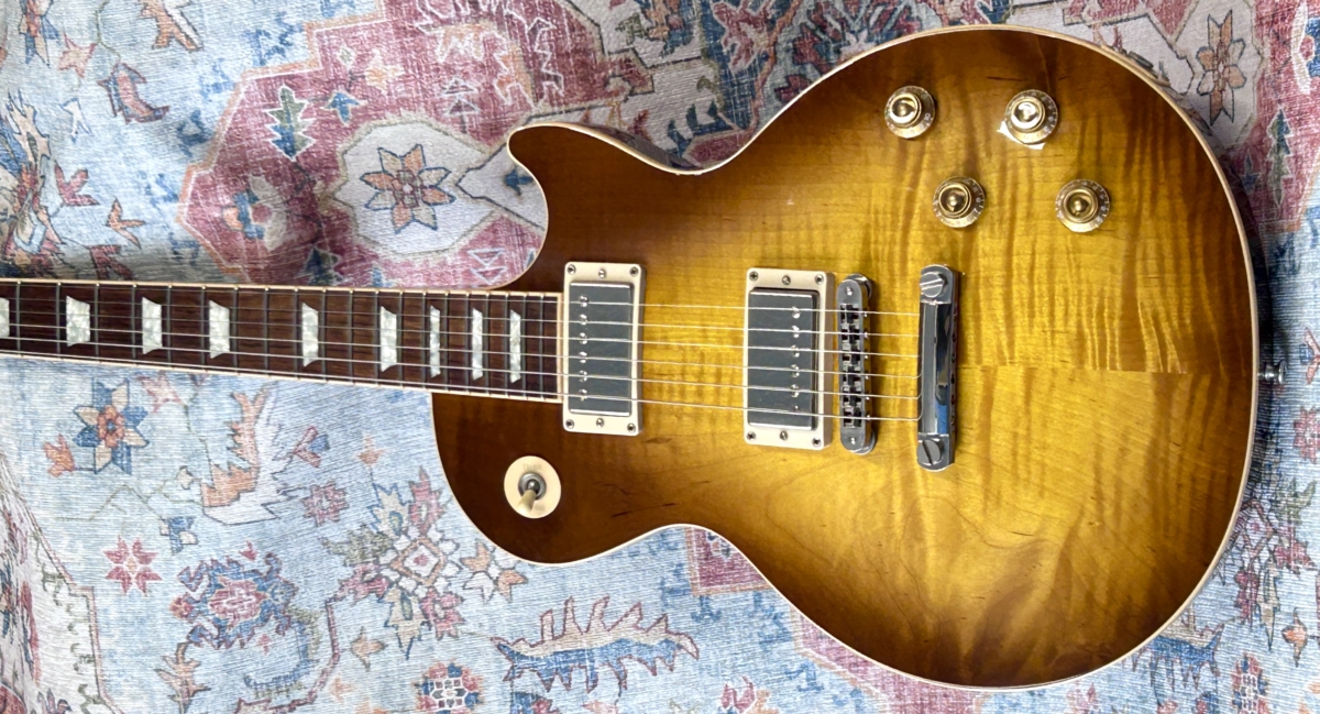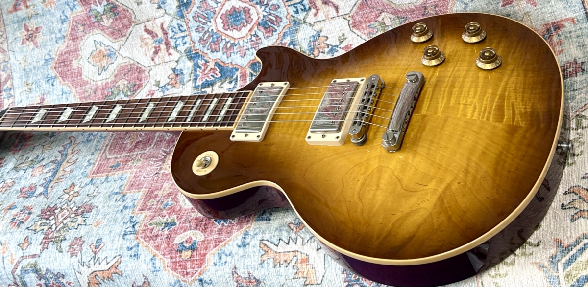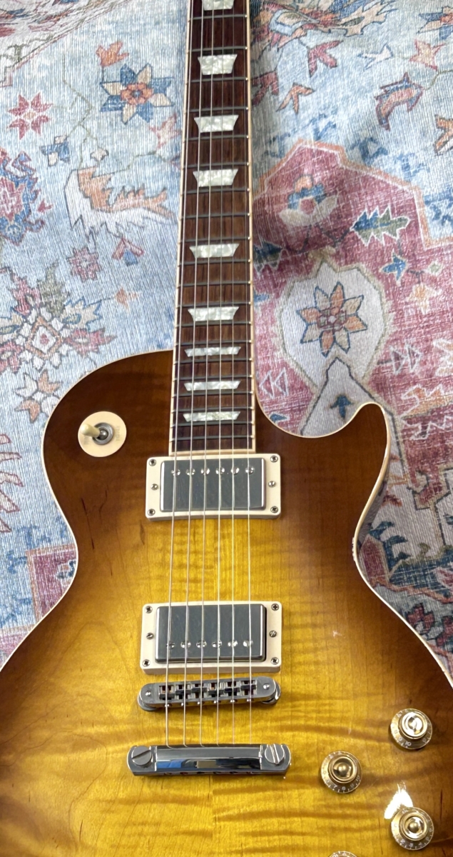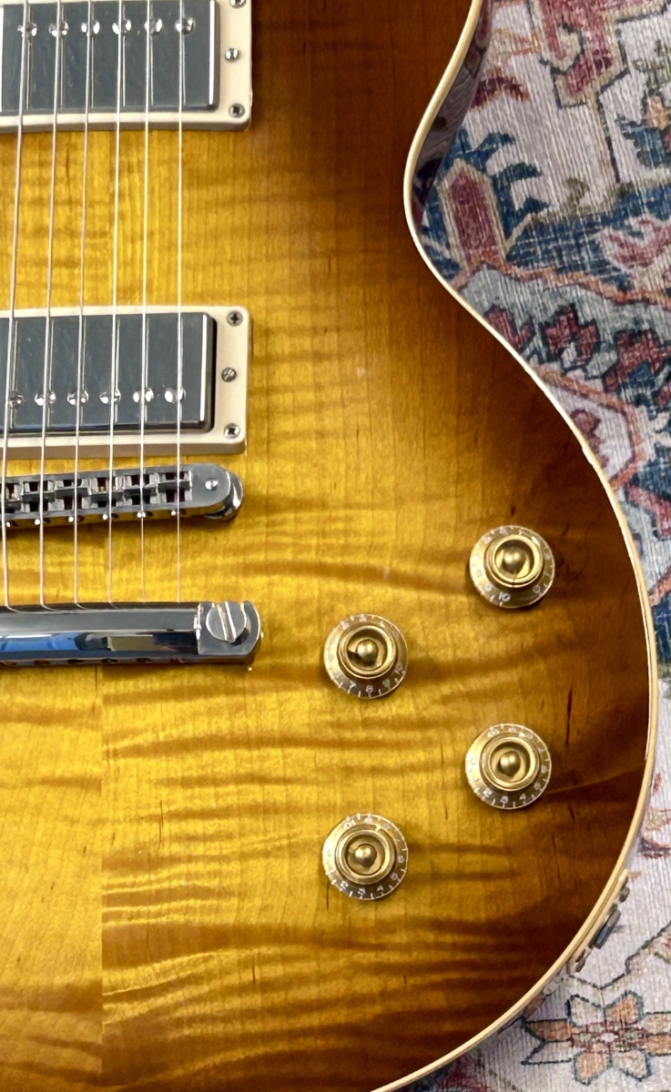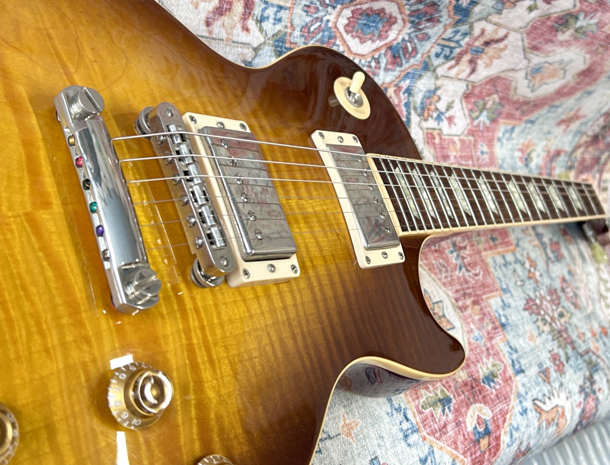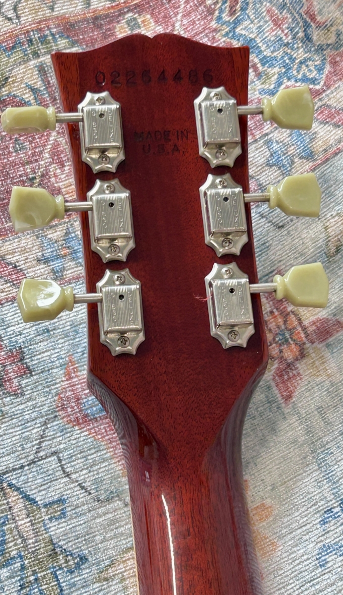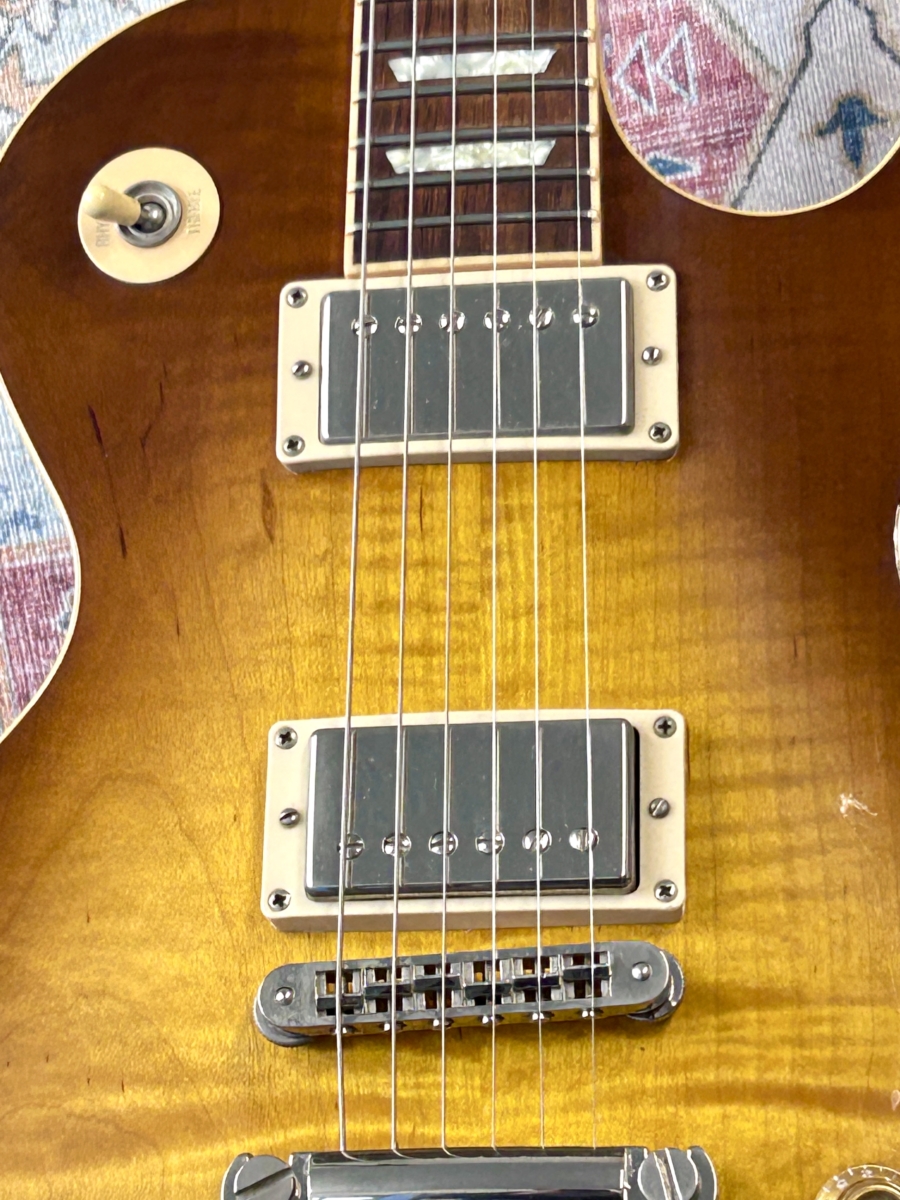 - Fitted with Gibson Burst Bucker pick-ups – paf flavoured, with alnico V magnets and ‘unmatched’ windings – #1 at the neck position that measures 7.43K – #2 at the bridge position that measures 7.9K