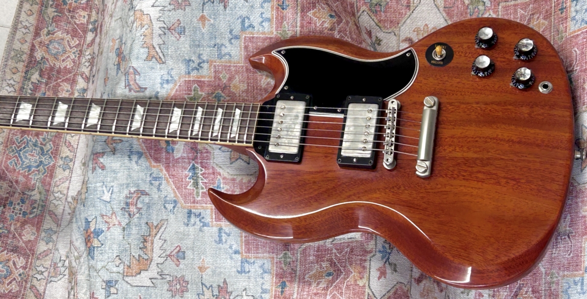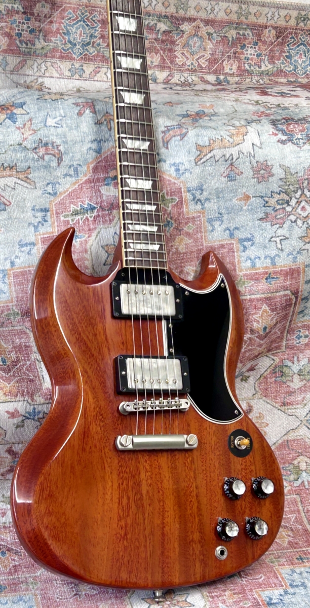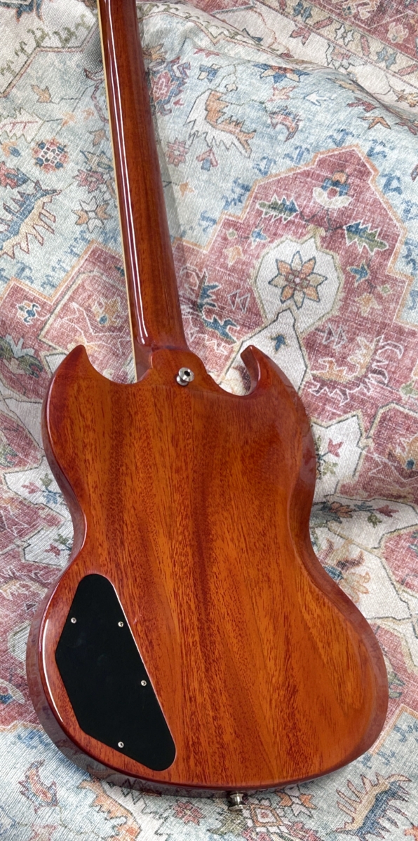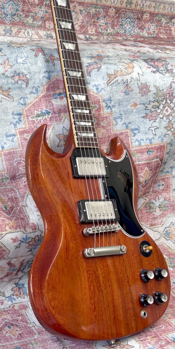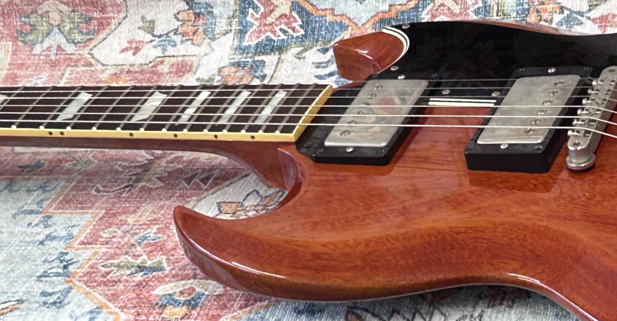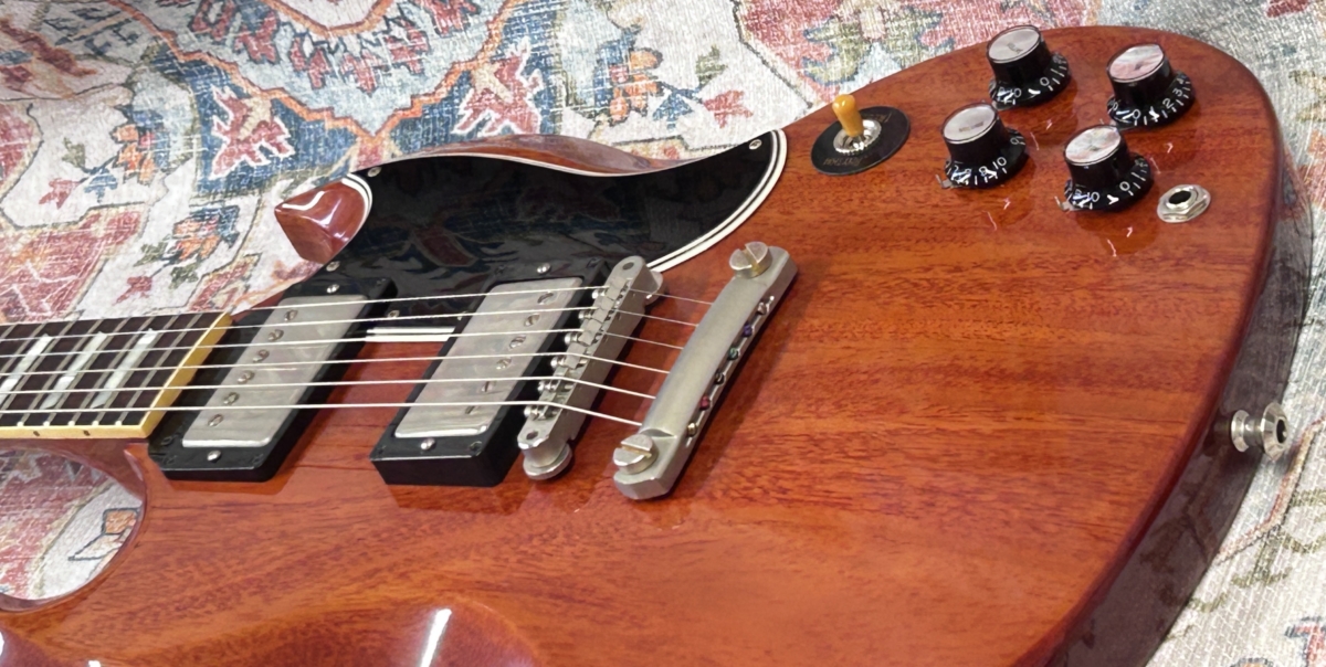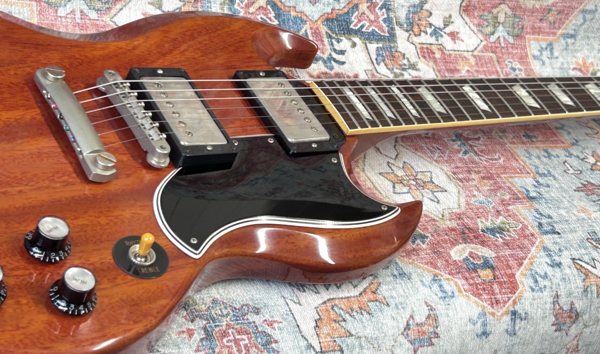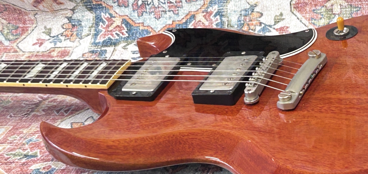 - VOS ‘very lightly aged’ finish – more of a mellow character, rather than gloss and shiny – But unlike most of the Fender Custom Shop relic models and indeed the Gibson Tom Murphy aged models, the VOS models are not factory aged with dings, dints and wear and tear – So maybe imagine you’ve just found a 1961 SG that has not been played for over 60 years – Was kept in its case, under the bed, during that time, but the nitro finish has slightly mellowed and the nickel hardware has slightly tarnished – That may well sum up the factory VOS finish