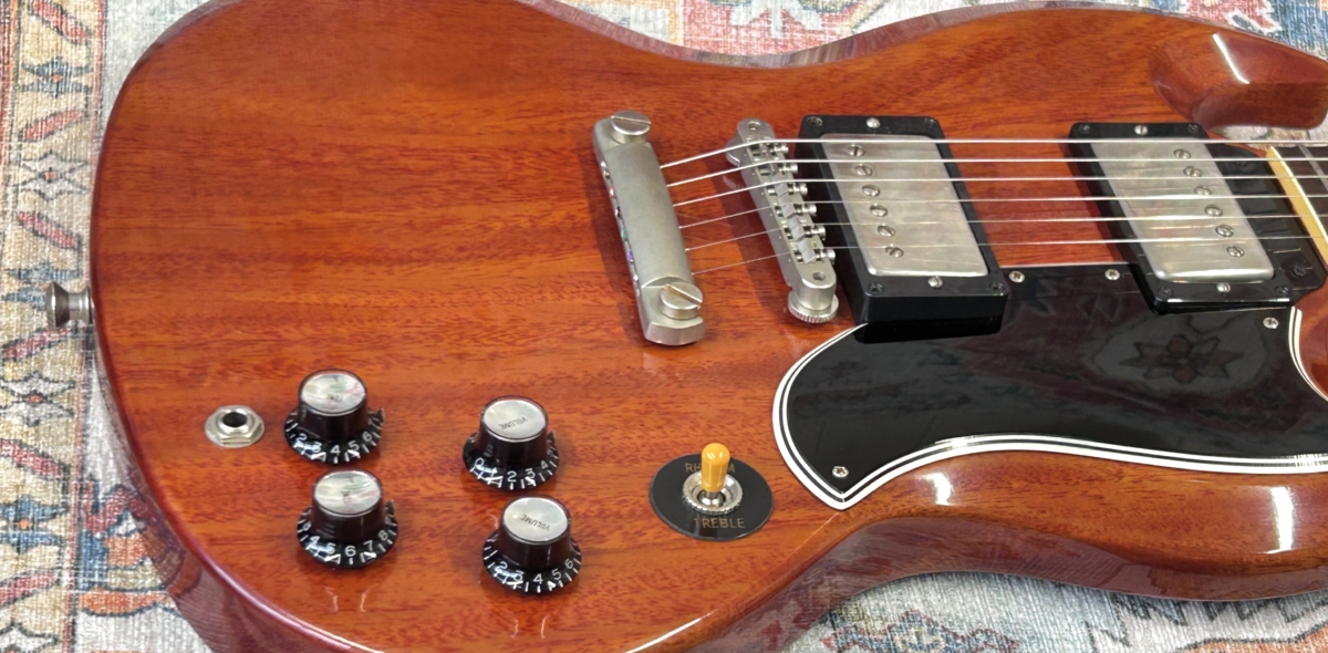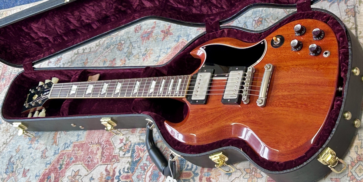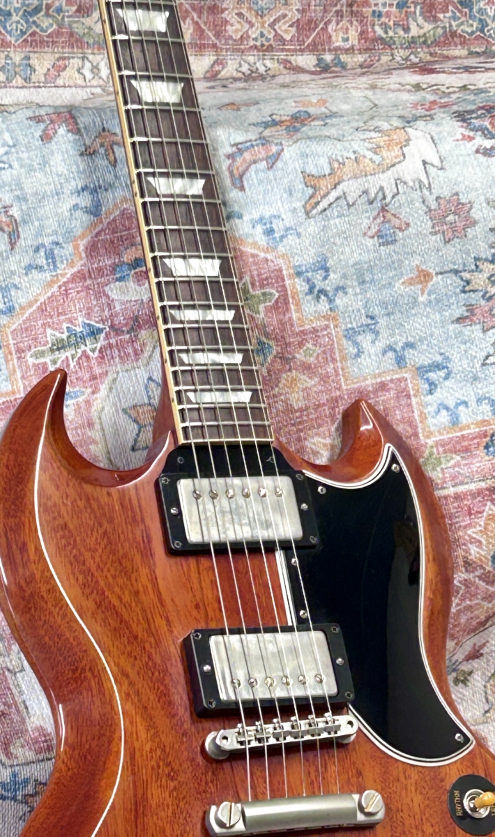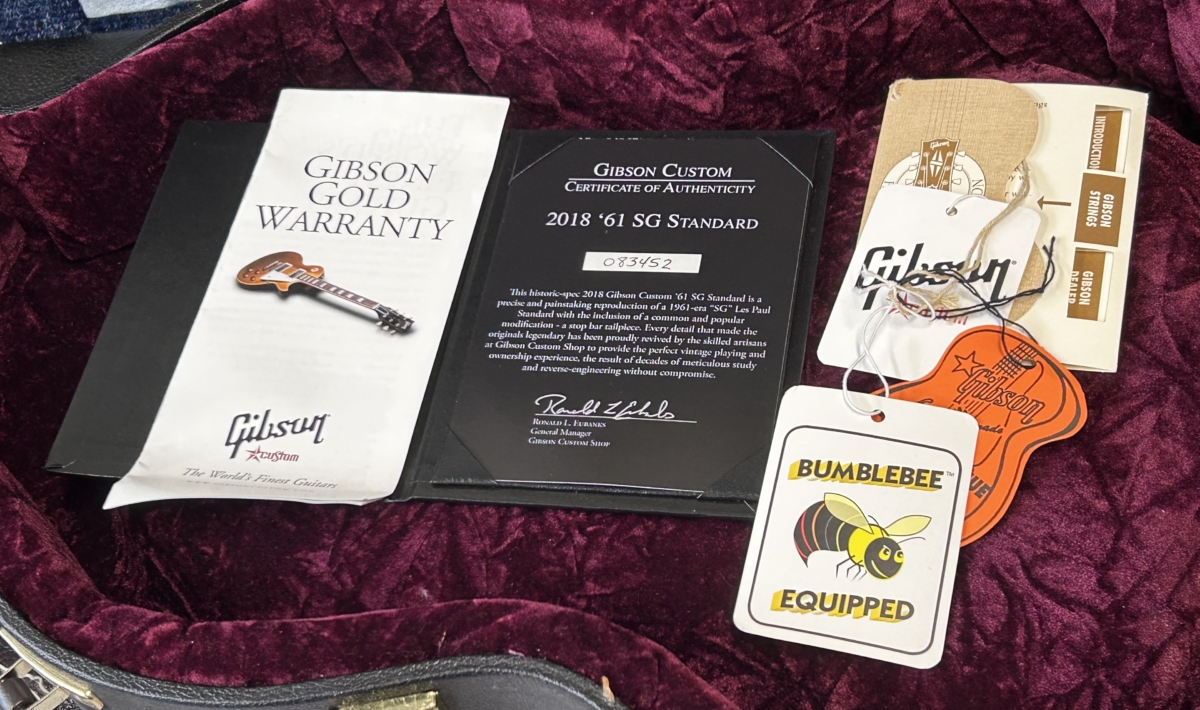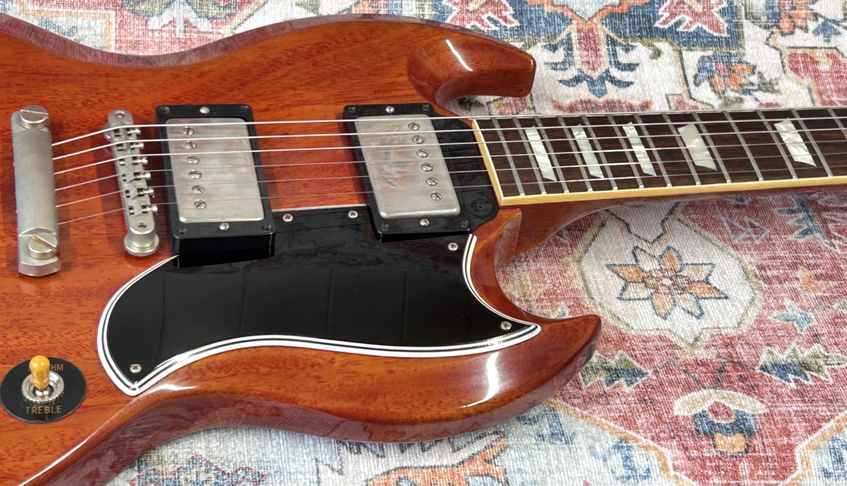 If we look back over the last 65 years, then it is fair to say that five guitars have largely dominated the sound of popular music – Strat, Tele, 335, Les Paul and the SG – I know Rickenbacker, Gretsch and later Floyd Rose based Supa Strats, amongst others, have had somewhat of a major influence at various times, but keeping it simple, then the Strat, Tele, SG, Les Paul and 335 have consistently been the major players – Together they’ve influenced most of the far eastern copy market, over the last 50 years or so – They still possess key features, shapes and styles that many of today’s custom ’boutique’ luthiers utilise as part of their own blue print – They are probably the five top selling guitars amongst todays popular ‘signature model’ market place, as well as the lucrative ‘Custom Shop vintage replica’ market – And it is the latter we turn to when I introduce you to this Gibson Custom Shop Historic 61 SG Standard – A used model from 2018 with a ‘very lightly aged’ VOS faded cherry finish – Part of me says that do I need to tell you anything about such a used guitar, but in true Guitars4You style there is always some key information that I can share with you – So in no particular order then please note the following info :-