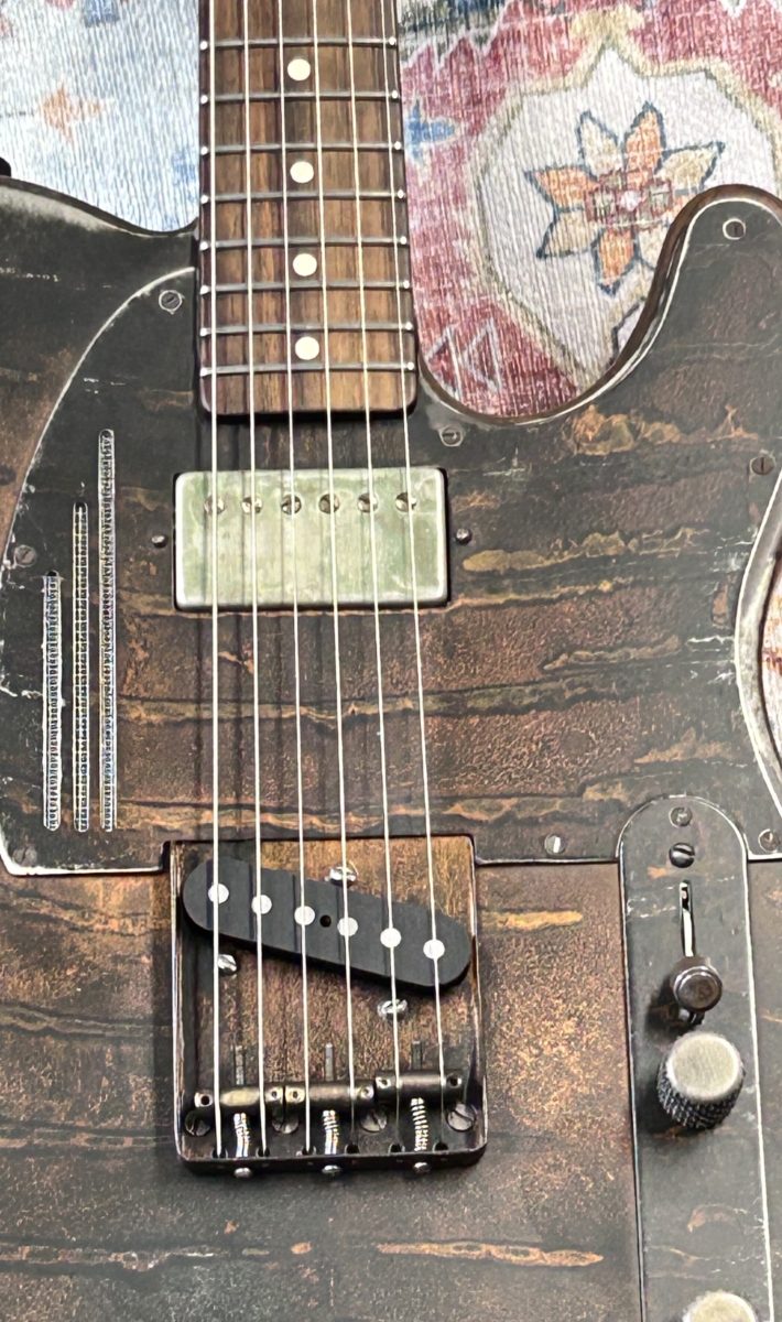 Tonal qualities – A factory spec’d hand wound Arcane humbucking pick-up is chosen for the neck position to bring out the best from the Steelcaster – A warm sounding paf based humbucker, so very much a vintage flavoured model, that measures 7.45K – Normally the factory spec of such a model would feature a hand wound Arcane single coil T based pick-up – A previous owner changed this, so it is now spec’d with a hand wound Mojo single coil pick-up – Still very much from the black guard early 50’s Broadcaster era, with flat pole pieces, that kicks out just over 10K – The Broadcaster style pick-up competes with the humbucker, with no shortage of balls, growl, bite and attack and a well balanced selection of tones across both pick-ups, via the 3 way switch – Note, the tone pot has a push/pull feature, to offer a split coil option on the neck humbucker, so more of a ‘funky’ single coil voice, as/when required – Despite what you initial expectations maybe, the tone is not hard, brittle, nasty, clangy or sharp – On clean amp settings, the neck pick-up is warm enough, to even satisfy players who may possess chilled out jazz tendencies, with a delightful hollow woody vibe about it – Again on clean amp settings the bridge pick-up has a full bodied twang about it, musically warm and certainly not brash and with no shortage of body/depth/girth – On crunch or hi-gain amp settings the same applies with lush smooth tones from the neck pick-up, whilst classic crunchy Tele tones pour out from the bridge pick-up, that work well for both chord work or single note licks – From sweet and soft to hot and screamin’, this Trussart is loaded with character, very dynamic and responsive to your playing needs