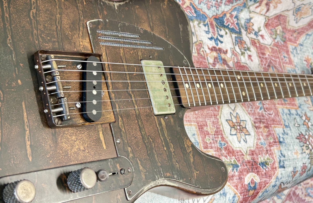 Visual Appearance :- Some will describe the character of this Steelcaster as different, idiosyncratic, cool, weird or simply unusual – Each guitar is individually aged, in this case, with a ‘rust-o-matic’ finish, with all the hardware aged accordingly – The Steelcaster features a hollow metal body with a Holey (perforated) back – This format helps to bring the guitar in at 8lbs, so certainly credible and maybe somewhat surprisingly lighter than many would expect – Trussart offers a Steelcaster, as featured here, as well as a Steelcaster Deluxe – The only difference between the 2 guitars is an f-hole on the Deluxe model – Maybe on a Fender Tele there is a difference between a ‘Thinline’ model with the F hole and a regular Tele, in that the former is more of a semi hollow model, whilst the latter features a solid body – But on a Trussart model it is just a simple case of aesthetics, with or without an F hole