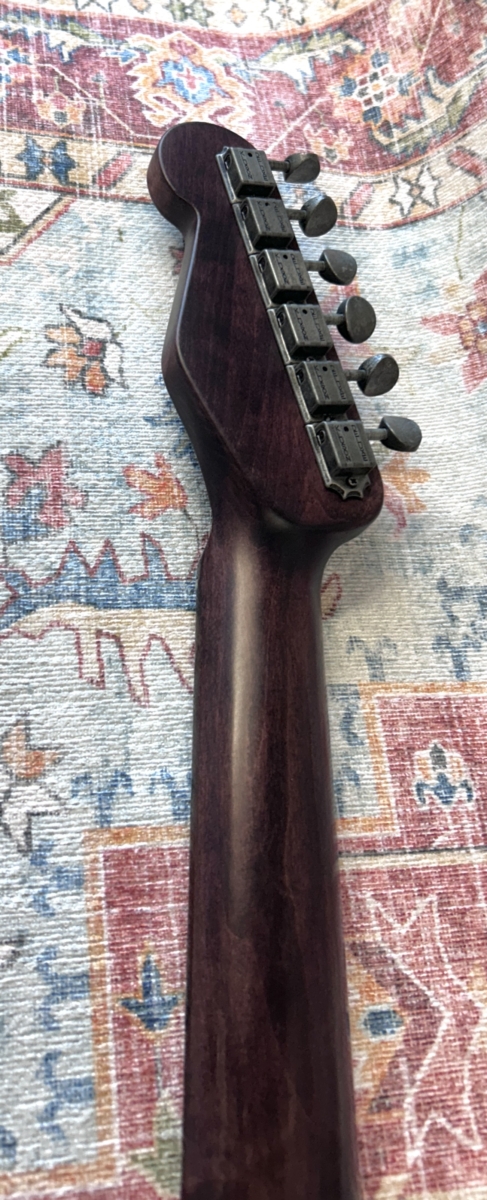 Neck/Feel/Playability :- Spec’d with a 62 neck profile, that measures .819″ at the top nut end, then gently tapers to .879″ at the 12th fret – This rounded C profile is straight from Fender’s early 60’s golden era, so home territory for many guitar players – Not to fat, so it sits in that middle ground that possesses just enough meat to be comfortable, yet without hindering your playing experience – Now enrich the playing performance with a 9″ radius on a maple fingerboard, along with a set of 6105 medium jumbo frets, all of which allows for a well balanced fluid action and effortless string bending, without the choking that can be associated with a more traditional 7.25″ radius, as per many pure vintage spec’d guitars – To give you that instant ‘played in’ feel, the maple neck is spec’d with a thin satin finish, so all in all a very comfortable guitar to play – Note the maple neck is stained with a ‘tobacco red’ character – Set-up with a set of 10’s and a nice fluid playing action – Finally, note that the Steelcaster still features the traditional 25.5″ scale length, along with a 1 5/8″ nut width – The aged hardware includes a set of Tone Pro tuners with the ‘Kluson’ style slotted string post, whilst the bridge possesses a set of brass saddles – Note the strings sit in a slight ‘groove’ on each pair of the brass saddles, for improved string alignment – Knurled control knobs, plus a barrel style switch tip on the 3 way switch