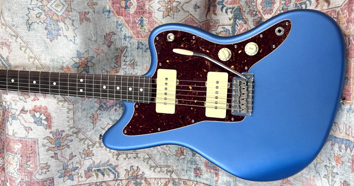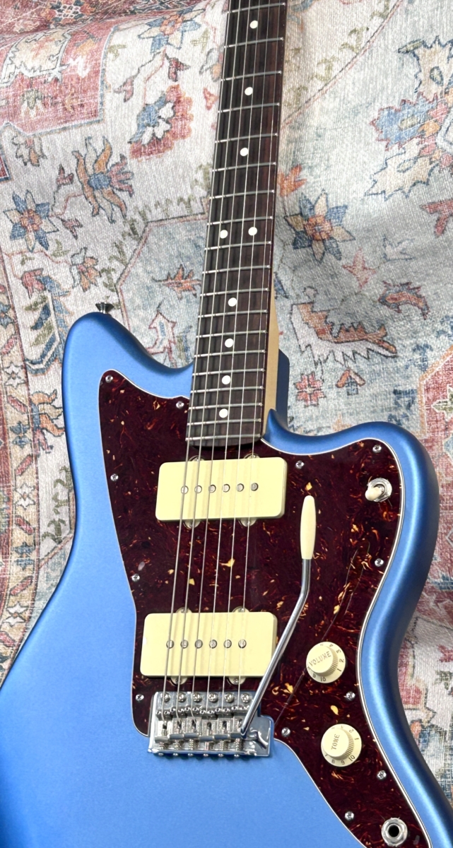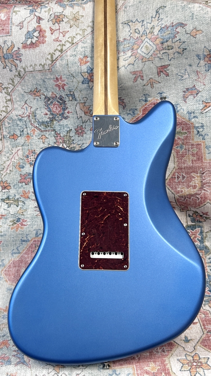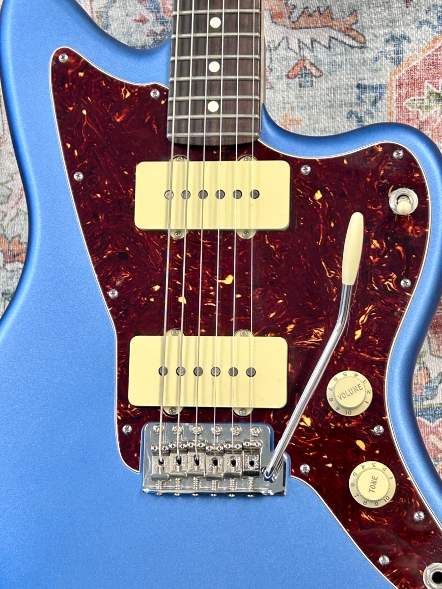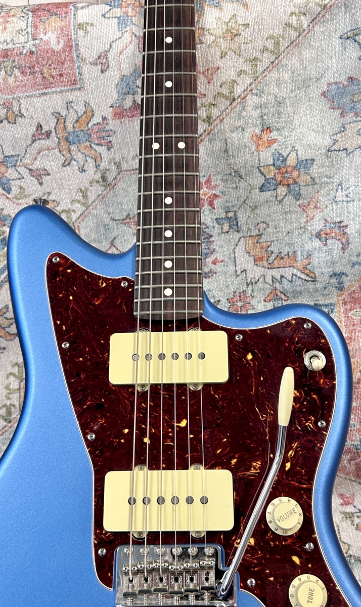 Is the Fender American Performer Jazzmaster really a Jazzmaster ? – If you look at the decal on the headstock facia, then the answer is yes – If you look at the offset body shape, then again you can say yes – Look at the pick-ups and again you can say yes – Yet the lack of the complex wiring loom, with a host of slider switches, the Jazzmaster trem package, including the appropriate bridge assembly, will lead you towards an unequivocal no – In my opinion it is a Strat, with a pair of Jazzmaster pick-ups, that cool Jazzmaster body shape, along with a Jazzmaster decal on the headstock – Yet that is not a bad thing – In fact I think it is a great thing – It offers a different voice to a Strat, that retains the single coil clarity but ‘BIGGER’ – Equally it plays more like a Strat, so in my opinion more friendly and easier to handle than a Jazzmaster, especially if you are playing any complex licks and tricks – So read below to acquire more info with regards to this used example, from 2021, with a cool satin lake placid blue finish