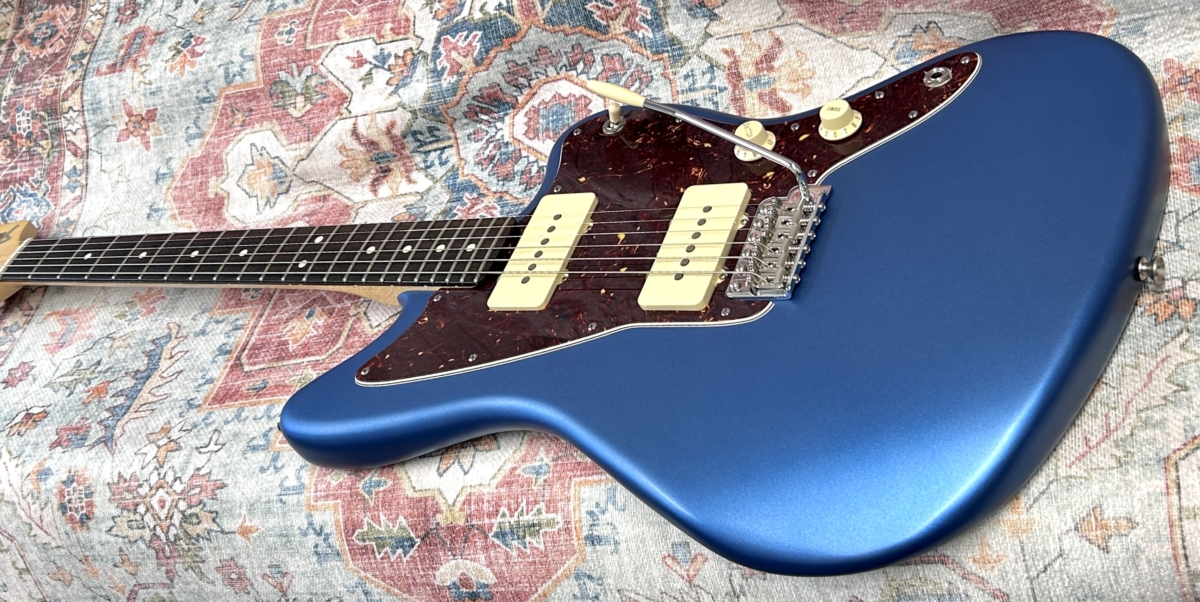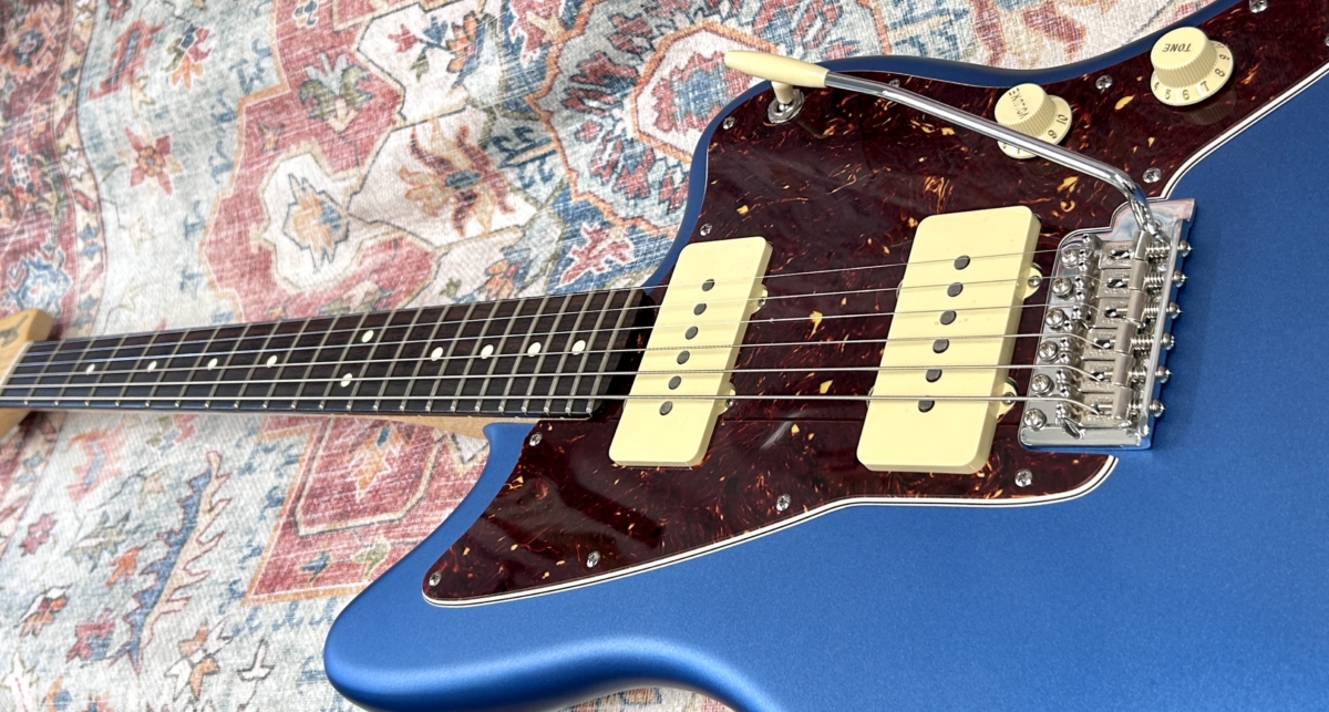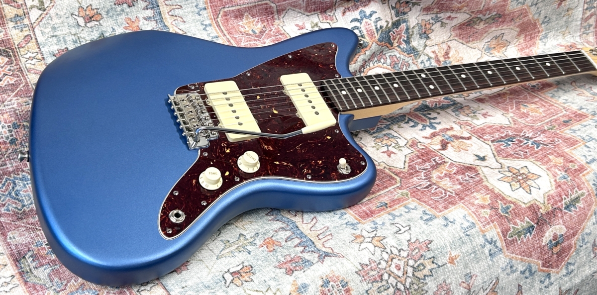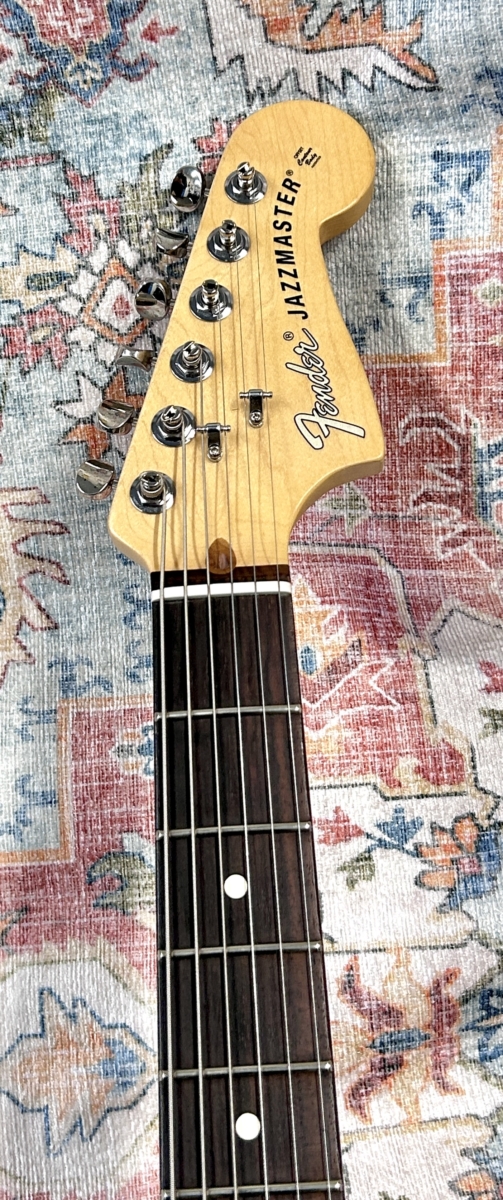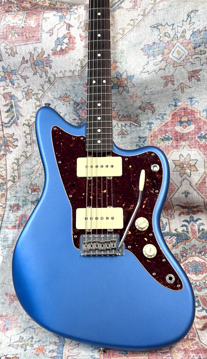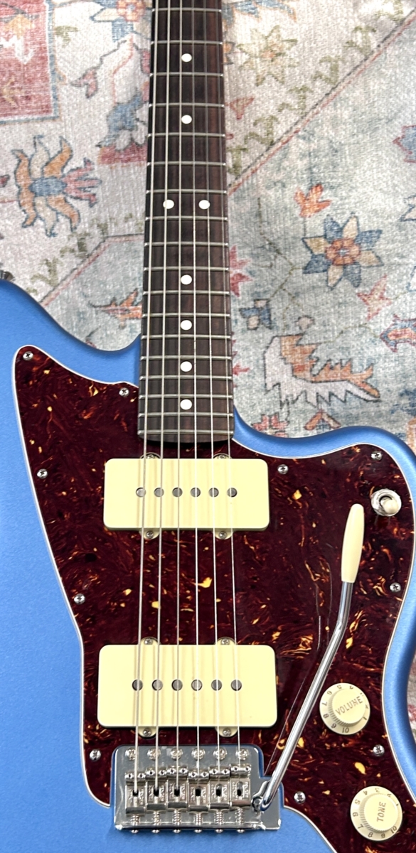 Is the Fender American Performer Jazzmaster really a Jazzmaster ? – If you look at the decal on the headstock facia, then the answer is yes – If you look at the offset body shape, then again you can say yes – Look at the pick-ups and again you can say yes – Yet the lack of the complex wiring loom, with a host of slider switches, the Jazzmaster trem package, including the appropriate bridge assembly, will lead you towards an unequivocal no – In my opinion it is a Strat, with a pair of Jazzmaster pick-ups, that cool Jazzmaster body shape, along with a Jazzmaster decal on the headstock – Yet that is not a bad thing – In fact I think it is a great thing – It offers a different voice to a Strat, that retains the single coil clarity but ‘BIGGER’ – Equally it plays more like a Strat, so in my opinion more friendly and easier to handle than a Jazzmaster, especially if you are playing any complex licks and tricks – So read below to acquire more info with regards to this used example, from 2021, with a cool satin lake placid blue finish