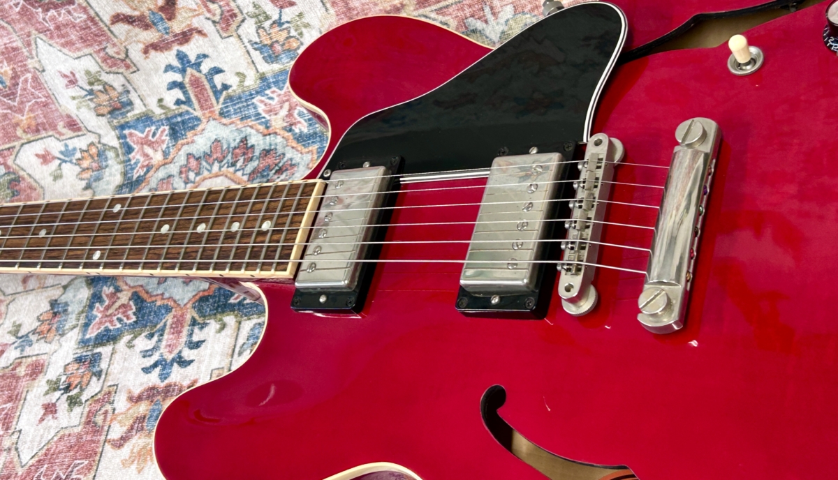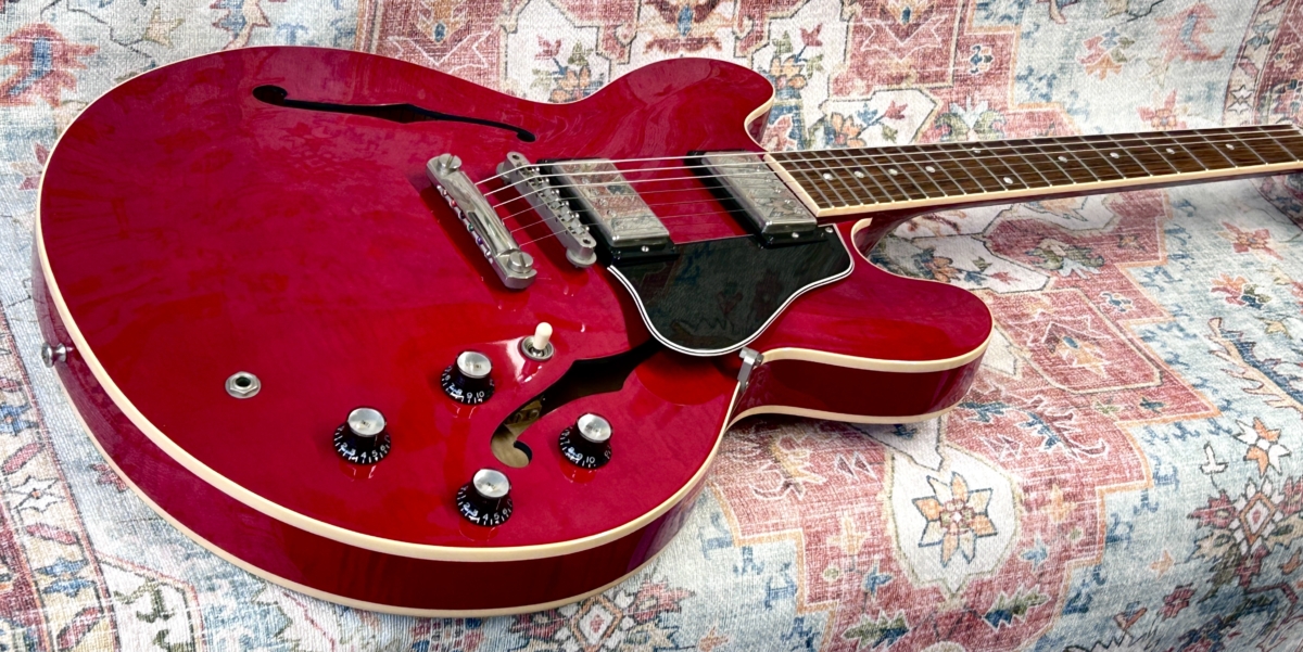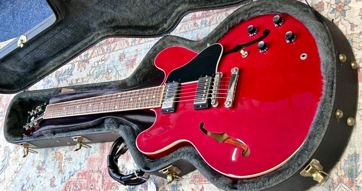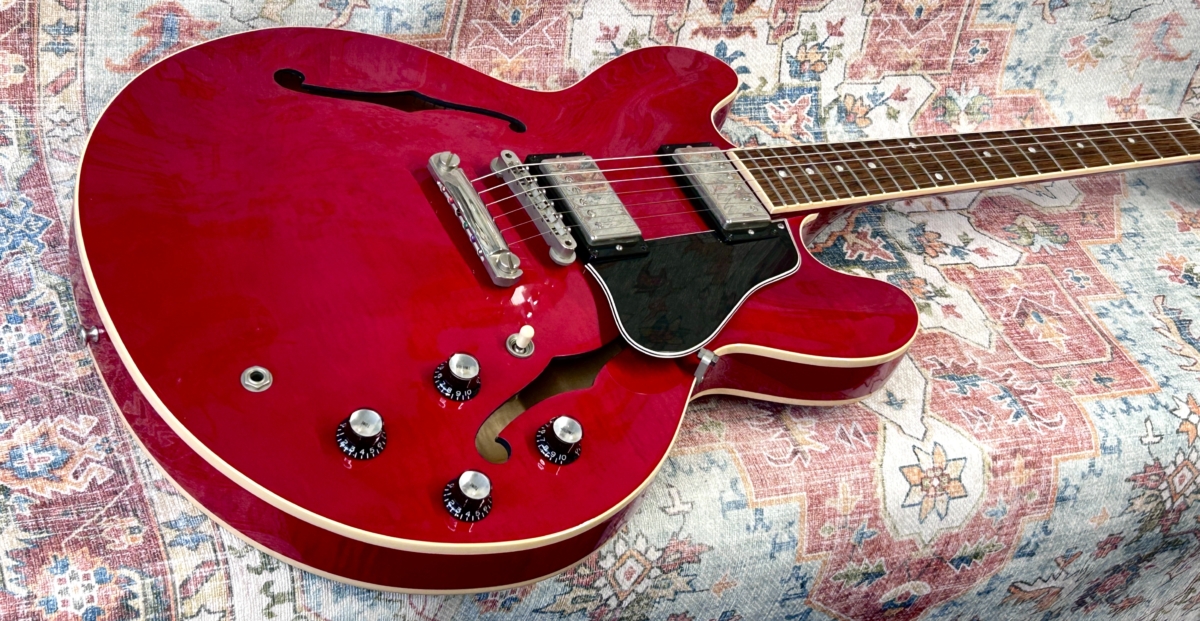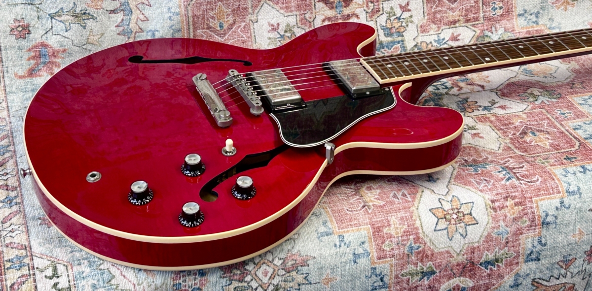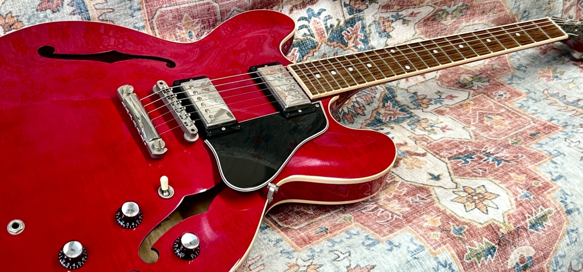 I’m always in the market to acquire a tasty used Gibson ES335 Dot Reissue, from 2004, with a classic translucent cherry gloss finish, that sits on a figured maple body – The internal orange label confirms that this is a Memphis model – For a guitar that is now over 20 years old, you might well expect to find that it possesses far more signs of wear ‘n’ tear – It is not in that ‘as new/mint’ condition, or anything like that, but it is fairly clean nonetheless, with little in the way of any negative issues to report and certainly nothing nasty whatsoever – Any slight hint of the odd graze to the nitro gloss finish is barely skin deep, at worse – With little in the way of any compression marks, be it a buckle graze, or rash to the rear of the body – A touch of fade to the gloss finish, so add the usual ‘foggy’ aged vibe to all the nickel hardware and you’ll have a used guitar with a signs of that Gibson VOS character – Frets are fine – Following a short visit to my work bench I’ve fitted a new set of 10’s, checked the set-up, polished the frets and cleaned the board with lemon oil, so already to go with a nice sensible easy action