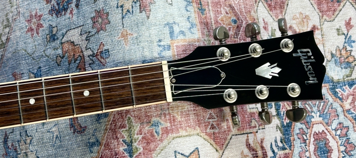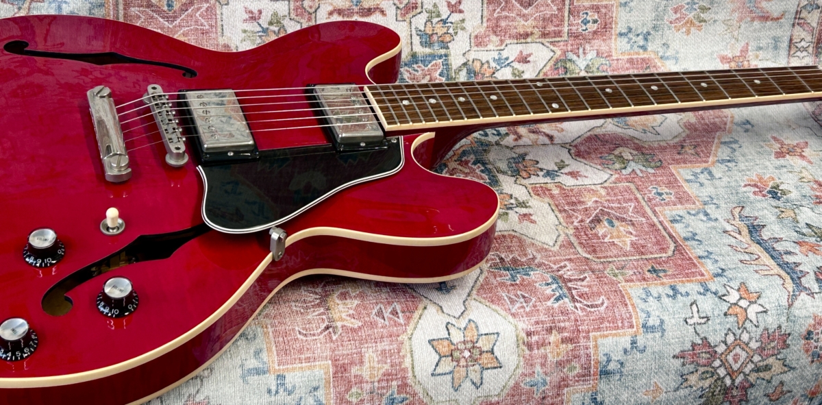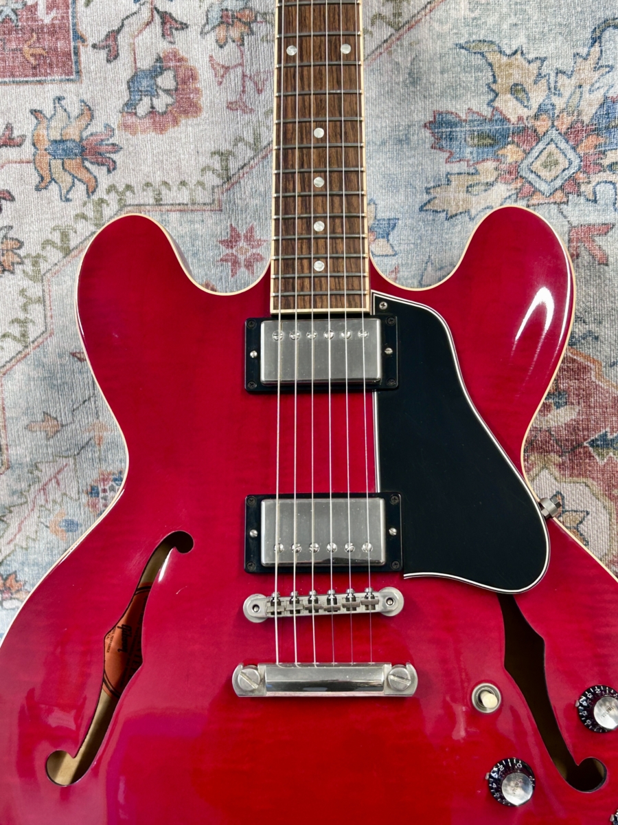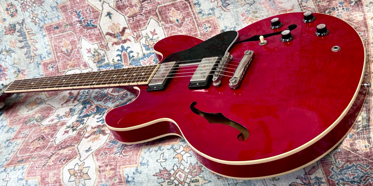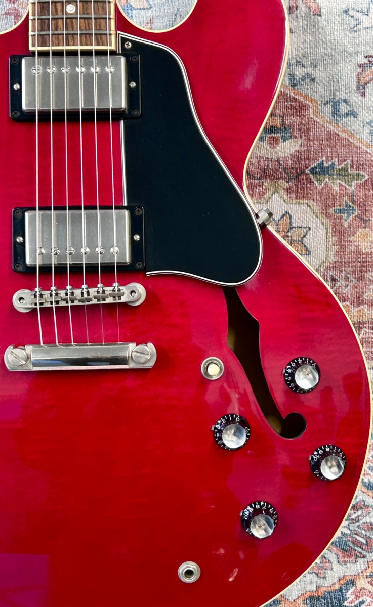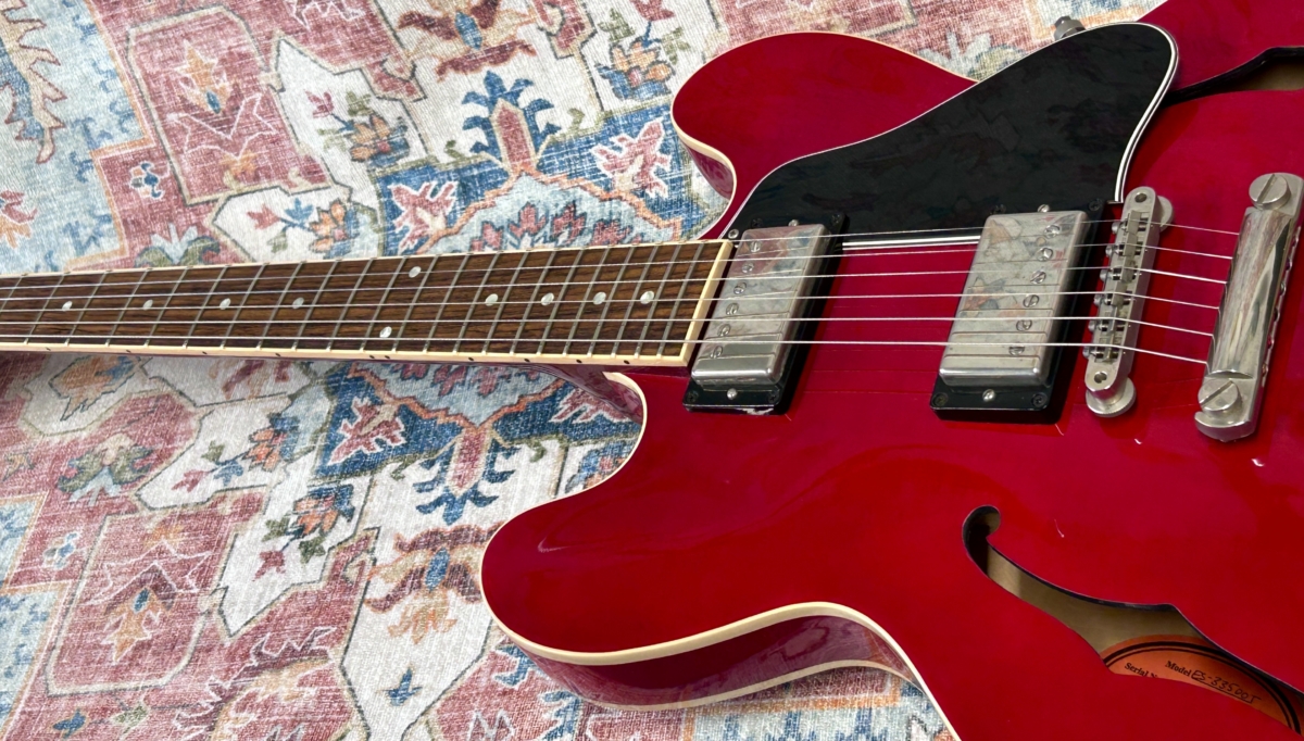 I’m always in the market to acquire a tasty used Gibson ES335 Dot Reissue, from 2004, with a classic translucent cherry gloss finish, that sits on a figured maple body – The internal orange label confirms that this is a Memphis model – For a guitar that is now over 20 years old, you might well expect to find that it possesses far more signs of wear ‘n’ tear – It is not in that ‘as new/mint’ condition, or anything like that, but it is fairly clean nonetheless, with little in the way of any negative issues to report and certainly nothing nasty whatsoever – Any slight hint of the odd graze to the nitro gloss finish is barely skin deep, at worse – With little in the way of any compression marks, be it a buckle graze, or rash to the rear of the body – A touch of fade to the gloss finish, so add the usual ‘foggy’ aged vibe to all the nickel hardware and you’ll have a used guitar with a signs of that Gibson VOS character – Frets are fine – Following a short visit to my work bench I’ve fitted a new set of 10’s, checked the set-up, polished the frets and cleaned the board with lemon oil, so already to go with a nice sensible easy action