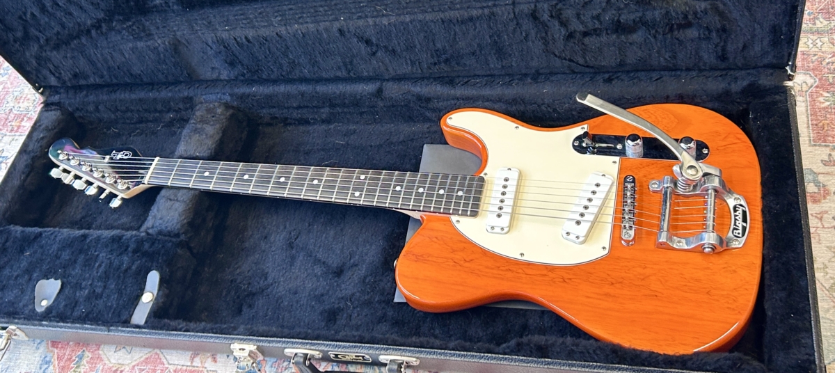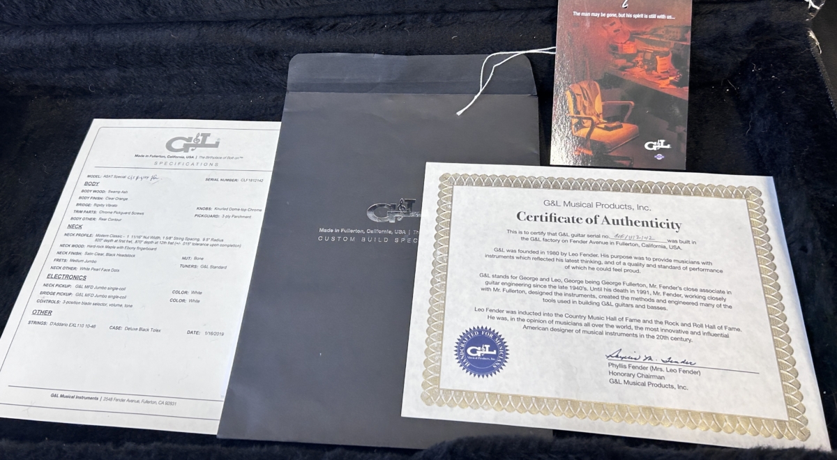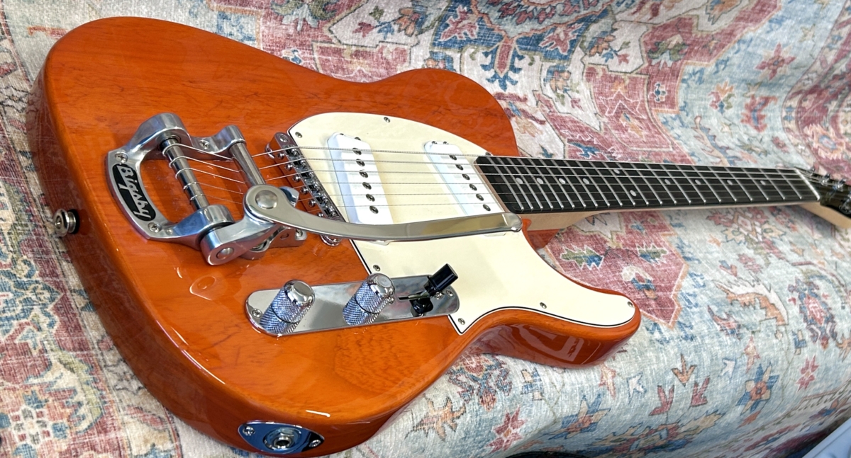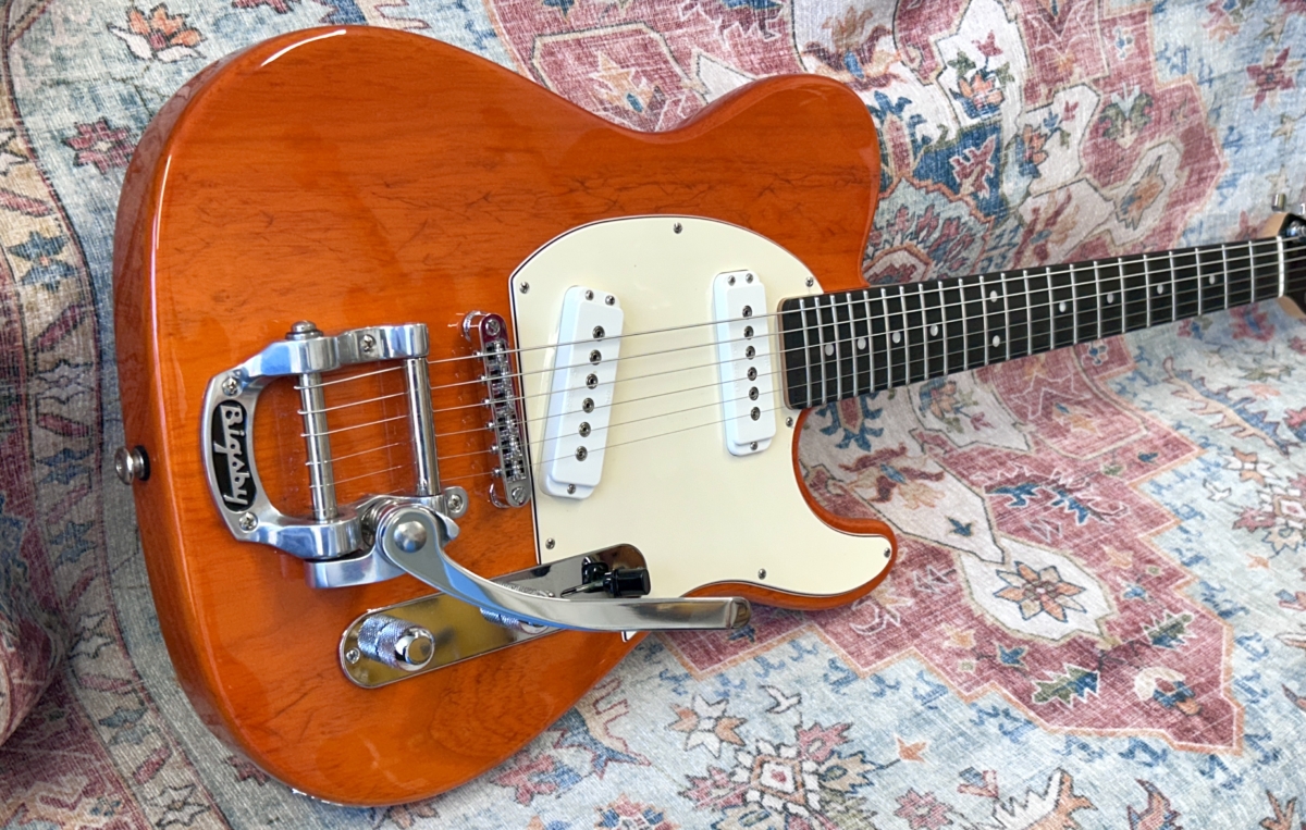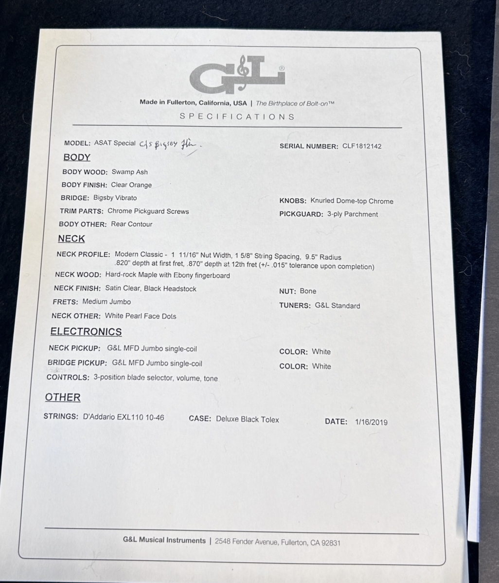 Overview :- Somewhat ironic that Leo Fender found so many faults with the original early 50’s black guard Tele – As a designer/engineer, he would spend hours trying to fine tune many aspects of such guitars in order to enhance the guitars performance capabilities – So no this USA G&L ASAT Special with a Bigsby, is not a traditional pre-CBS copy – But it certainly takes on many aspects of a hot rod Tele – Whilst the Bigsby and translucent orange finish give it some of that Gretsch appeal , which is further enhanced with a pair of G&L MFD single coil pick-ups, that capture strong hints of a P90 and Gretsch Dynasonic – So read on, to gather additional info with regards to this used USA model from 2019